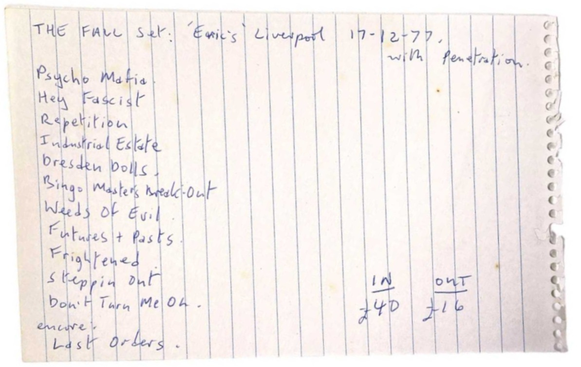Saturday, 17 December, saw the group returning to Eric’s, Liverpool, England as a support to Penetration. There is no recording but once again a setlist was made.